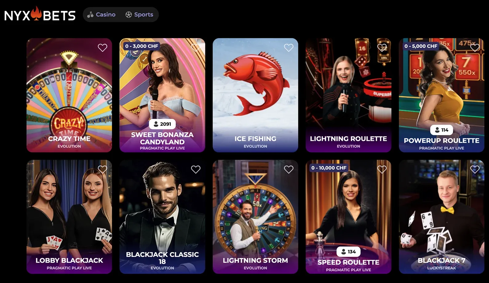 Nyxbets biedt een uitgebreid aanbod met honderden gokkasten, live casino spellen, tafelspellen zoals roulette en blackjack, en videopoker. Alle spellen komen van toonaangevende providers zoals NetEnt, Microgaming en Evolution Gaming. Het assortiment wordt regelmatig uitgebreid met nieuwe titels.